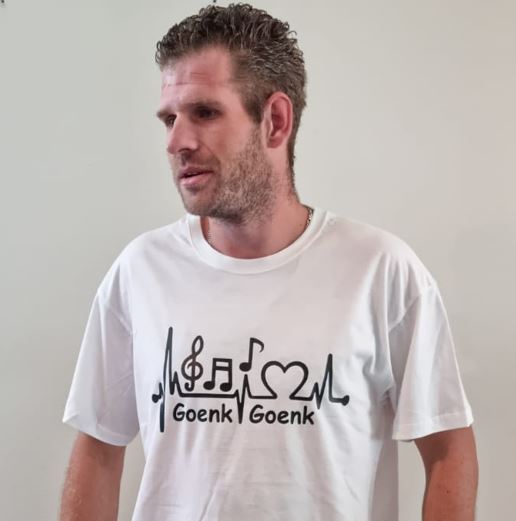Mooie witte GoenkGoenk T-Shirt welke voor en achter bedruk is met het GoenkGoenk love logo